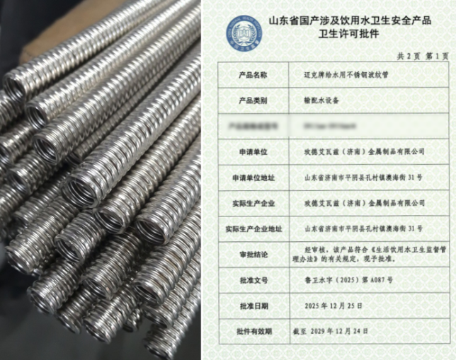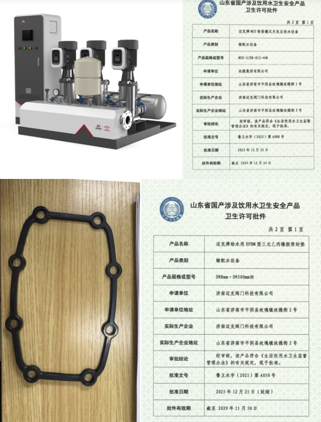 近日,玫德集团旗下三类给水系列产品成功取得卫生许可批件,标志着集团在民用及市政给水领域的合规性与安全性获得权威认可。本次获批产品包括:玫德集团有限公司生产的“迈克牌MCG智能罐式无负压供水设备”、济南迈克阀门科技有限公司生产的“迈克牌给水用EPDM型三元乙丙橡胶密封垫”以及玫德艾瓦兹(济南)金属制品有限公司生产的“迈克牌给水用不锈钢波纹管”。