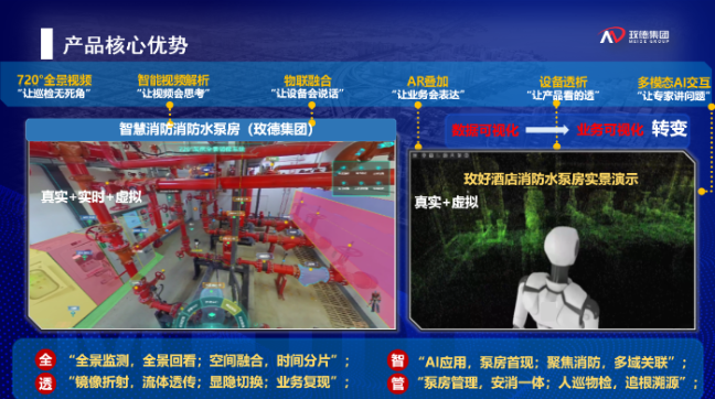 玫德智慧泵房四维空间融合系统,依托人工智能、AR/VR及720°全景视频技术深度融合,构建起一套全方位、全流程、全维度的泵房智能管理体系,更是AR+全景视频技术在流体输送领域的首例实战应用,也是AI技术在水泵房场景中的首例深度应用,开创了智慧消防水泵房场景应用的新范式。